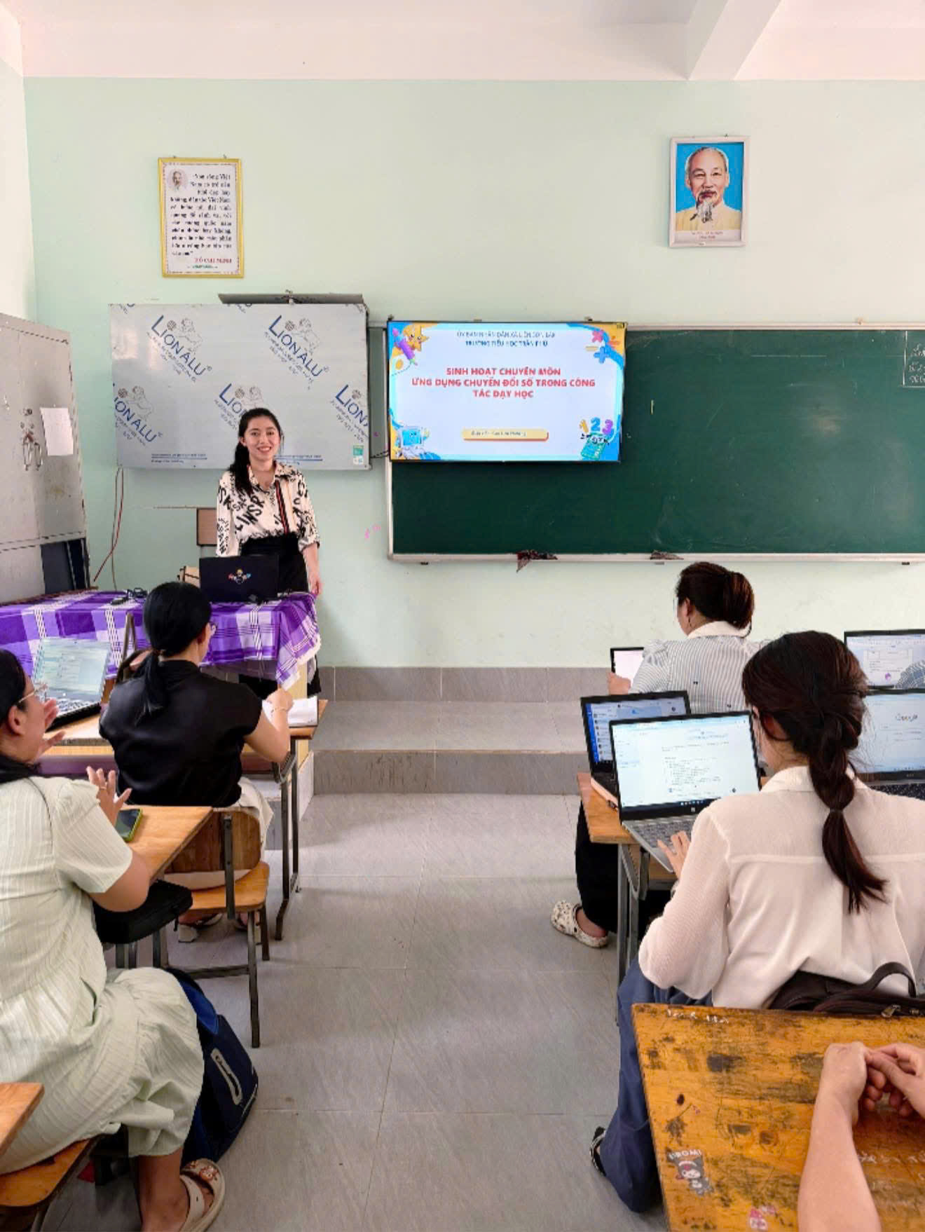 Chiều thứ Sáu, ngày 17/04/2026, Trường Tiểu học Trần Phú tiếp tục tổ chức buổi sinh hoạt chuyên môn với nội dung ứng dụng chuyển đổi số trong công tác giảng dạy. Buổi chia sẻ tập trung vào việc sử dụng các công cụ như Gemini, Suno kết hợp với Canva nhằm nâng cao hiệu quả bài giảng và sáng tạo trong dạy học.